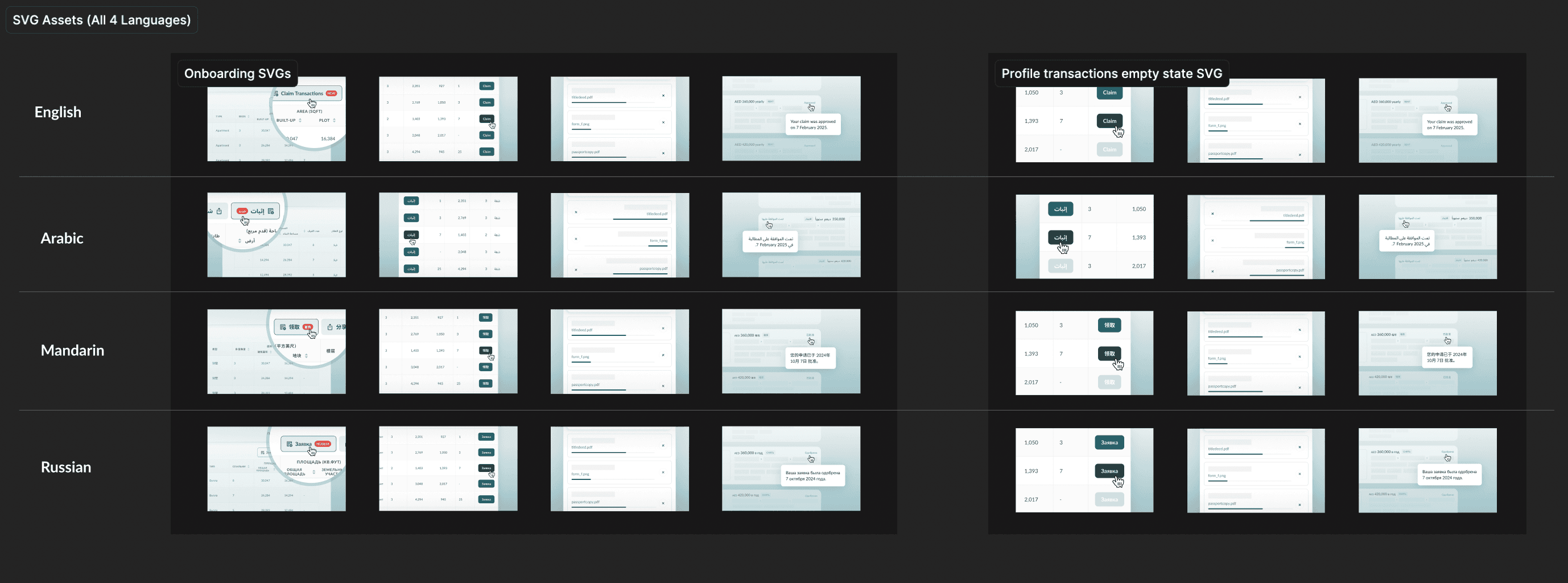 For the onboarding flow, I had to create 4 SVG assets for 4 different languages — English, Arabic, Mandarin, and Russian. That in itself wasn't the difficult part. It was the pedantic changes I had to make on each one of them after each round of review.
